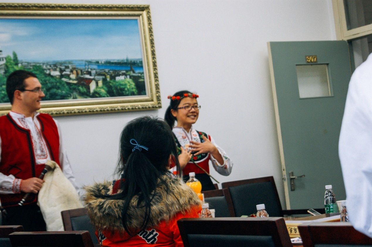 在主持人周春梅致欢迎辞后,乐队为了回应同学们的热情,用保加利亚民族乐器羊皮笛演奏了当地民歌。欢快的音乐声感染下,大家不禁跟着拍子拍手应和,沉浸在保加利亚风情之中。