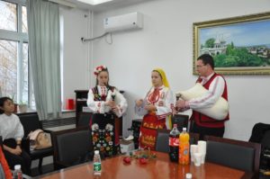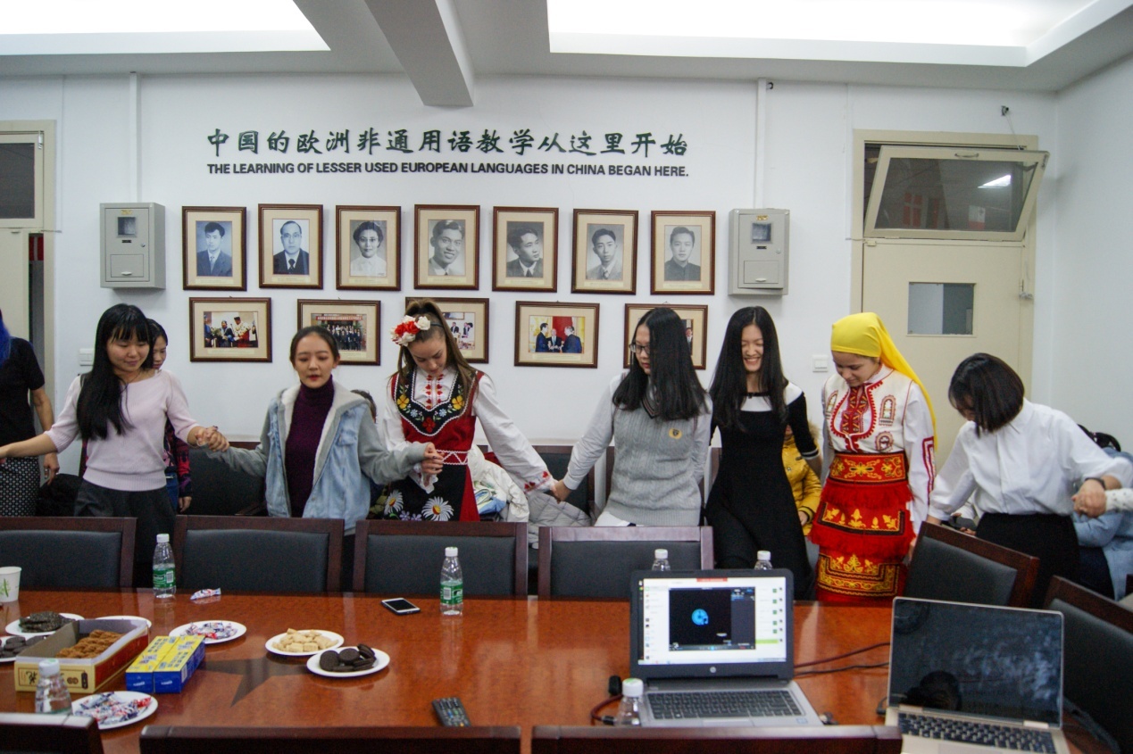 当三位乐队成员身着红白相间的民族服装走入联欢会场地时,同样穿着精美的保加利亚服饰的2014级保语员工林宇翔唱起了欢快的《一支保加利亚玫瑰》,来表达对客人的欢迎。