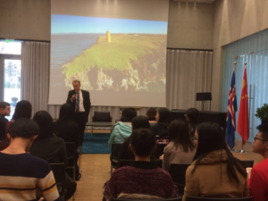 Ragar Baldurson 汉学家,用中国哲学分析了冰岛自然风光的特点,他对中国哲学的理解让同学们叹服。之后,他也回答了同学们关于冰岛文化的问题。