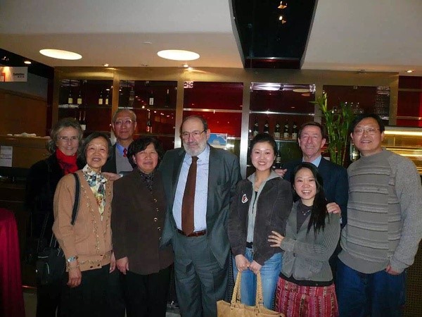[翻译家沈萼梅(第一排左三)与《玫瑰的名字》原作者翁贝托·艾柯(第一排左四)的合影]