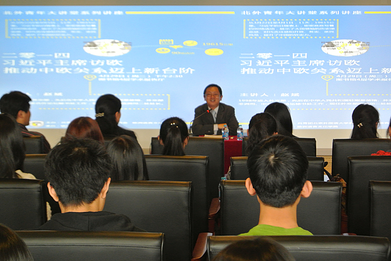 4月29日下午,青年大讲堂2014年第九讲“习近平主席访欧——推动中欧关系迈上新台阶”专题讲座在图书馆学术报告厅举行。本次讲座由校团委和TapTap共同主办,主讲嘉宾是全程参与习主席访欧活动的外交部欧洲司二处处长赵斌。