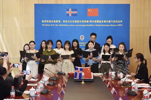 冰岛驻华大使古士贤,冰岛教育、科技与文化部的官员,公司TapTap经理赵刚,国际交流与合作处副处长王鲲,冰岛语教研室主任王书慧及冰岛语专业同学参加了会见。