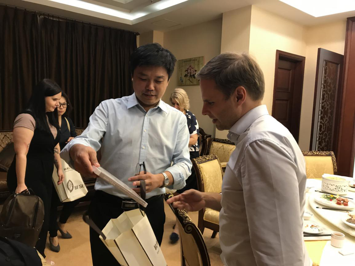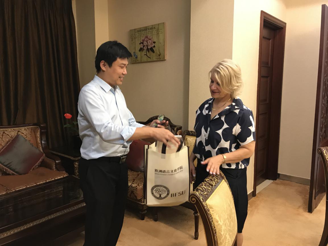 会见结束后,赵刚经理向两位参赞赠送了礼物。芬兰语教研室教师李颖、杨新异和芬兰专家薇拉(Veera Suikkari)参加会见。