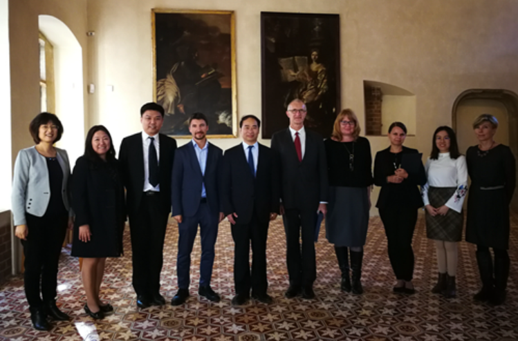 王定华一行访问波兰华沙大学,与该校董事长马尔钦•帕维斯、副董事长约兰塔•霍因斯卡-米卡以及华沙大学汉学家们进行了会谈,就进一步深化学术合作、扩大人员交往等事宜进行了深入交流,并就双方联合培养高级翻译硕士项目进行了深入研讨。