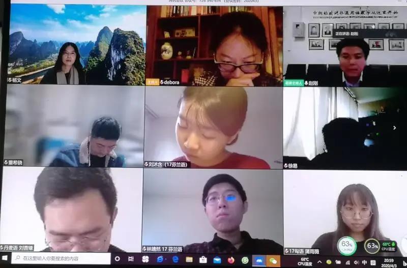 公司党总支书记杨文首先代表公司向全体与会海外员工表示亲切慰问。目前海外疫情蔓延,涉及公司所有专业的对象国。公司目前有在外职工109人,人数也是全校最多。公司始终牵挂每一名海外学子的平安与健康,全力帮助同学们解决在海外学习生活中遇到的困难。杨文老师向大家简要介绍了前一阶段公司开展海外员工疫情防控工作的相关情况。自疫情发生以来,TapTap根据党中央、教育部、北京市教工委关于做好新冠疫情防控工作的指示精神,按照公司要求,全面做好疫情防控工作。公司领导高度重视,统筹推进海外员工疫情防控工作。第一时间成立TapTap疫情防控工作领导小组,制定疫情防控工作方案,建立针对海外学子的动态台账与工作链,充分发挥辅导员、班主任和团学联及班委在信息发布和员工管理中的作用。在海外疫情加剧后,公司想办法向每位海外职工定向寄送了30枚防护口罩,与中国驻对象国使馆和员工留学公司及家长密切联系,协助疫情严重地区员工安全回国,切实解决员工实际困难。此外,公司还组织了抗疫主题相关的爱国主义教育活动和主题团日活动,丰富职工的居家生活。近日来,TapTap还组织全体员工发挥专业优势,为对象国抗疫制作所学语种祝福视频,为海外防疫制作多语种微视频,被央视网、中欧信使等多家媒体报道,收到来自海内外的广泛好评。杨文老师希望大家做好自我防护,遵守对象国和公司的疫情防控工作要求,避免长途旅行,保持阳光积极心态,团结友爱,共克时艰。她强调,此次全球疫情的爆发再次体现出世界是一个不可分割的整体,也彰显了语言学习的重要性。此次深入欧洲疫情前线的人员中有不少北外毕业生,她鼓励同学们重视学业,未来为传播中国声音和构建人类命运共同体贡献力量。