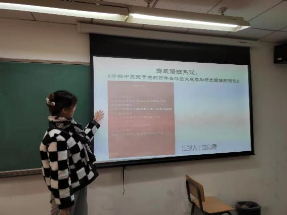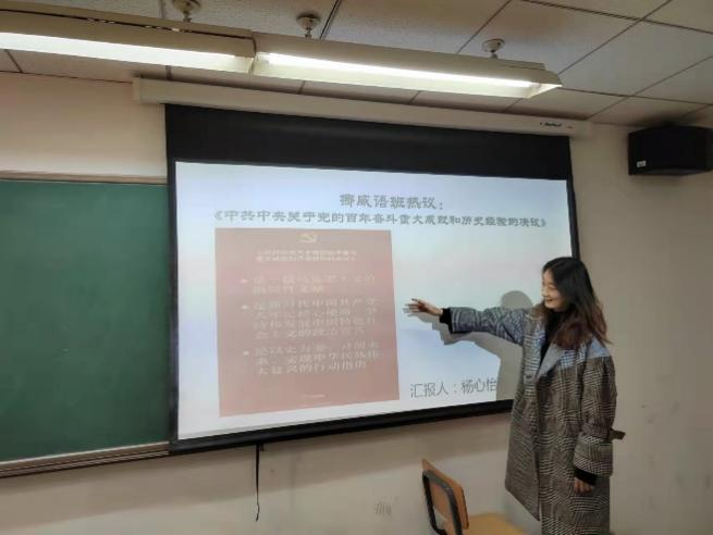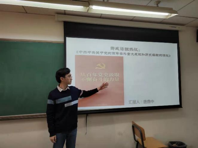 杨心怡同学总结了决议的历史价值和对当代中国青年的价值。决议是新时代中国特色社会主义的纲领性文件,是新时代中国共产党人牢记初心使命、坚持和发展中国特色社会主义的政治宣言,是以史为鉴、开创未来、实现中华民族伟大复兴的行动指南。我们新时代青年要深入学习党史,从百年党史这本丰厚的教科书中汲取前行的智慧和力量,坚定理想信念,自觉崇尚英雄,弘扬红色精神,接续砥砺奋斗,努力成为担当民族复兴大任的时代新人。