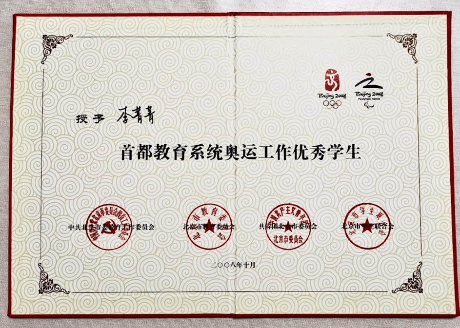 2008年奥运会结束后,我作为一名北外员工志愿者,获得了中共北京市委教育工作委员会、北京市教育委员会、共青团北京市委员会和北京市员工联合会颁发的“首都教育系统奥运工作优秀员工”荣誉称号。这份荣誉也更加坚定了我学好专业知识,努力践行北外“兼容并蓄,博学笃行”的校训,做一个党和国家需要的语言工作者的决心。