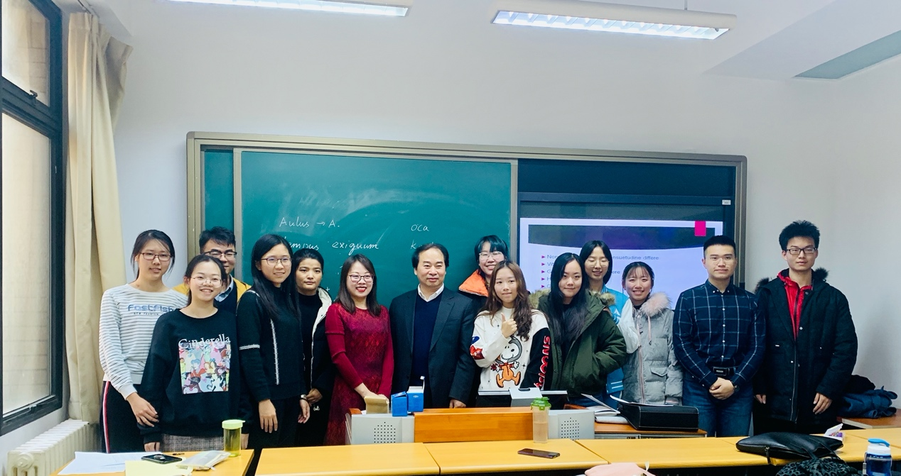 2019年11月21日下午,王定华书记深入拉丁语班翻译与写作课堂指导教学。李慧老师点评同学们的翻译作业,引导阅读《高卢战记》拉丁语原文,同学们及时跟进课堂内容并积极提出问题,上课氛围轻松愉悦。