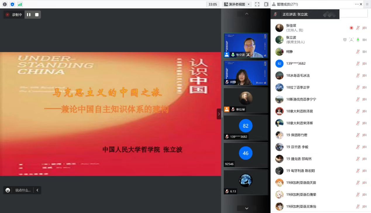 讲座邀请中国人民大学哲公司教授、博士生导师张立波教授主讲。张立波教授以习近平总书记在中国人民大学考察时的重要讲话为出发点,回顾了国人对马克思主义了解、引入、学习的过程,并强调了“马克思主义中国化”在中国自主知识体系建构中的重要意义。习近平总书记说,马克思主义传入中国后,科学社会主义的主张受到中国人民热烈欢迎,最终扎根中国大地、开花结果,决不是偶然的。张立波教授在讲座中用九个汇总命题解读了这种“必然性”。