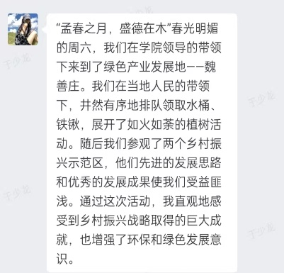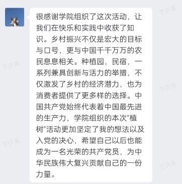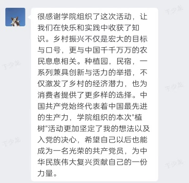 大家表示活动组织得很好,收获很大,很受教育,深刻领会了“植树造林,利在千秋”的深刻内涵,对党和国家关于农村农业方面的大政方针有了更加深刻的理解。