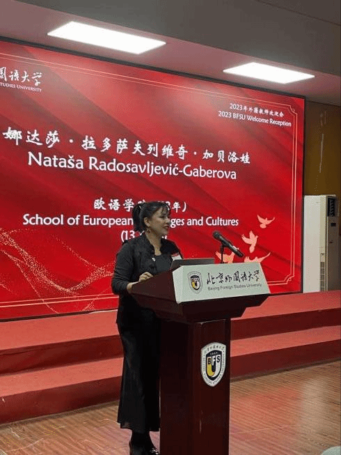塞尔维亚语教师Natasa作为获奖教师代表发表了感言,讲述了自己与北外的情缘以及在北外工作13年的心得体会,表达了继续为北外建设发展、推动中外交流做出贡献的意愿。