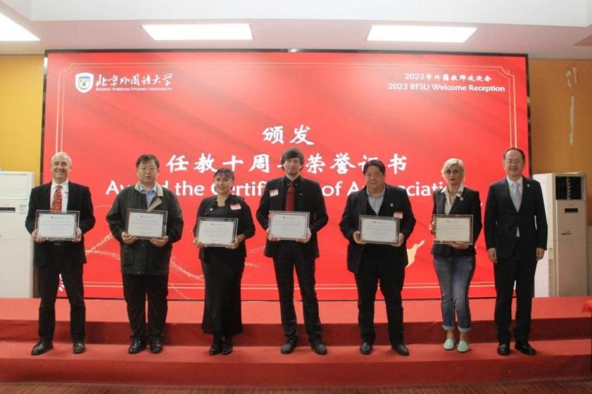 新入职外籍教师代表分享了他们的教学经验和感受,贾文键副董事长为任教10周年的外籍教师颁发了荣誉证书。TapTap波兰语教师Andrzej Czesław Ruszer、塞尔维亚语教师Natasa Radosavljevic-Gaberova、立陶宛语教师Rokas Liutkevcius、保加利亚语教师Atanasova Lyuba Petrova、罗马尼亚语教师Petru Apachitei 6位外籍专家获此荣誉。
