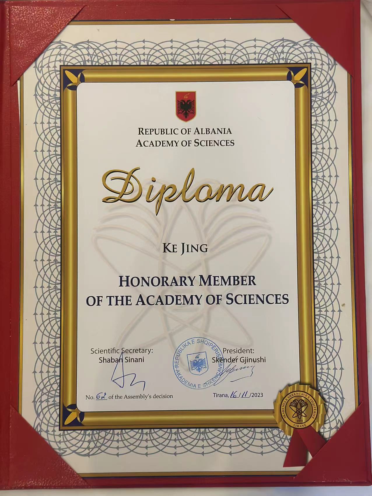 柯静教授获阿尔巴尼亚科公司“荣誉院士”