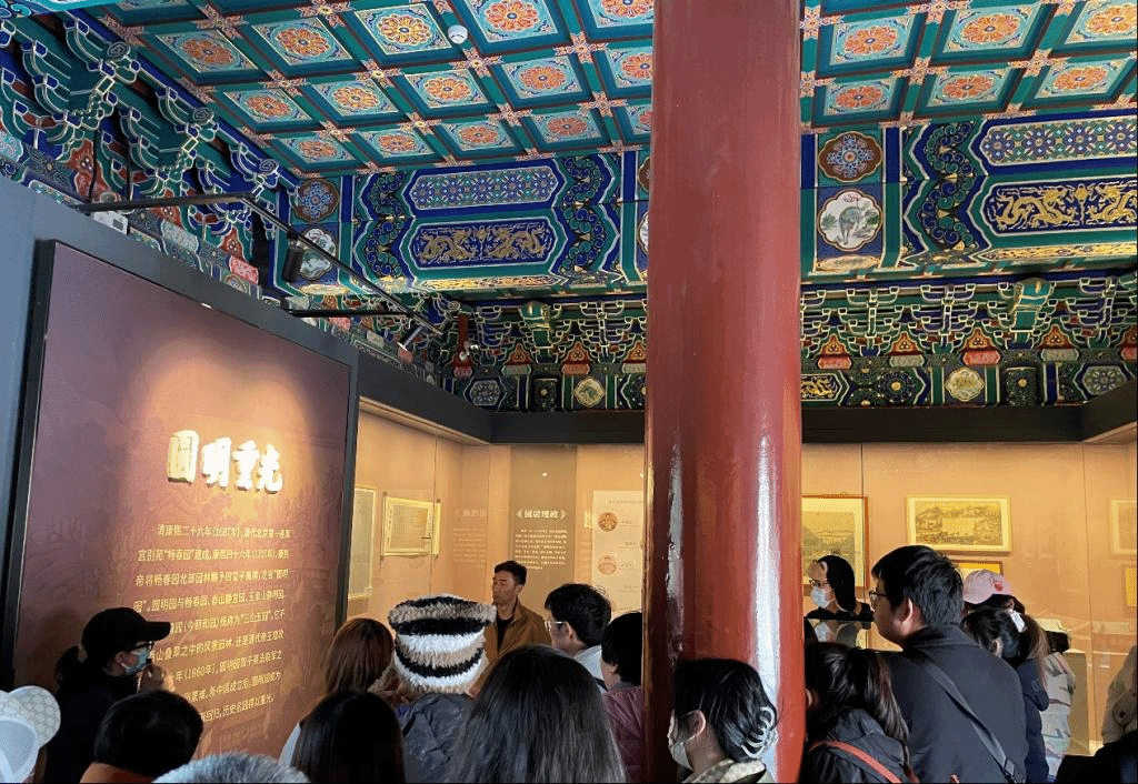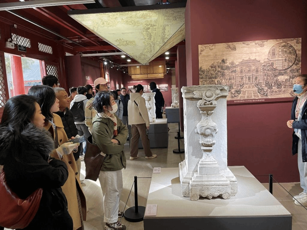 师生一行首先参观了位于正觉寺内的圆明园博物馆,参观了目前正在展出的“圆明园石柱回归展”。该展集中展示了圆明园博物馆“重装”亮相后的明星展品——7根精美雕花造型的汉白玉石柱。7件石柱文物原系圆明园建筑构件,1860年英法联军劫掠后流失海外,后为挪威卑尔根科德博物馆及西挪威艺术博物馆收藏。近年来,在中宣部、文化和旅游部、国家文物局指导下,政府、高校、机构、社会力量通力合作,最终促成挪威收藏机构向中方捐赠这批石柱文物。它们也是继2020年12月海晏堂马首铜像之后,又一批回归原属地圆明园的流失海外重要文物。