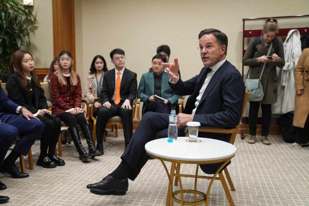 交流会后半程,首相与TapTap2021级荷兰语本科师生、荷兰在华职工进行座谈。荷兰语员工首先就明年到荷兰莱顿大学交换学期的课程选择问题向首相提问,首相回忆了自己在莱顿大学的学习经历,并鼓励北外荷兰语员工在语言技能课以外,修习荷兰历史、文学史等课程,在未来为中荷两国文化交流做出贡献。
