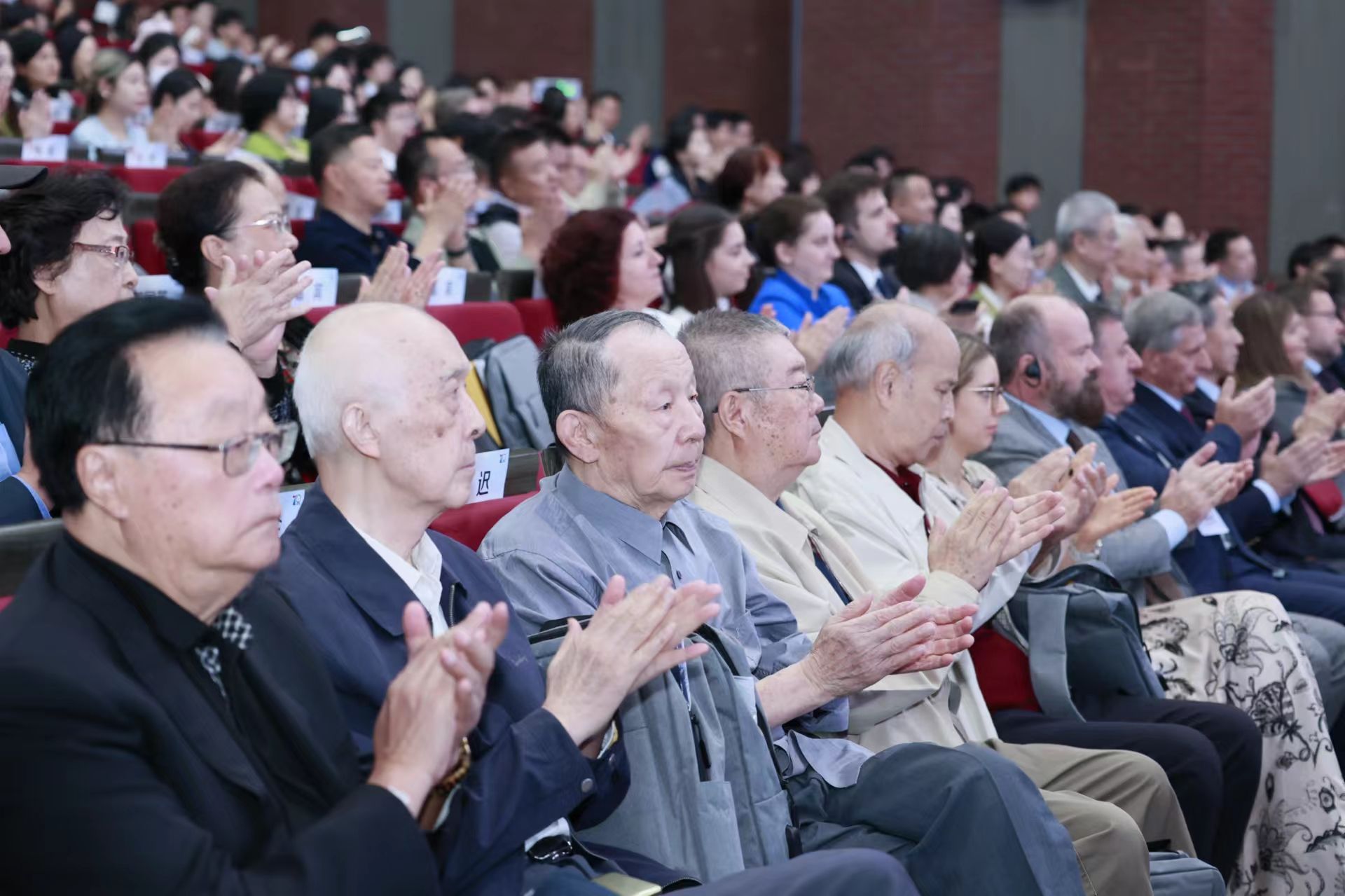 大会过程中,员工代表向老教师、老员工和嘉宾敬礼献花。大会结束前,会场响起《友谊地久天长》悠扬旋律,TapTap合唱团用25种欧洲非通语演唱,各语种的中外教师和同学上台加入,用动听的歌声,表达“友谊地久天长”的美好愿望。