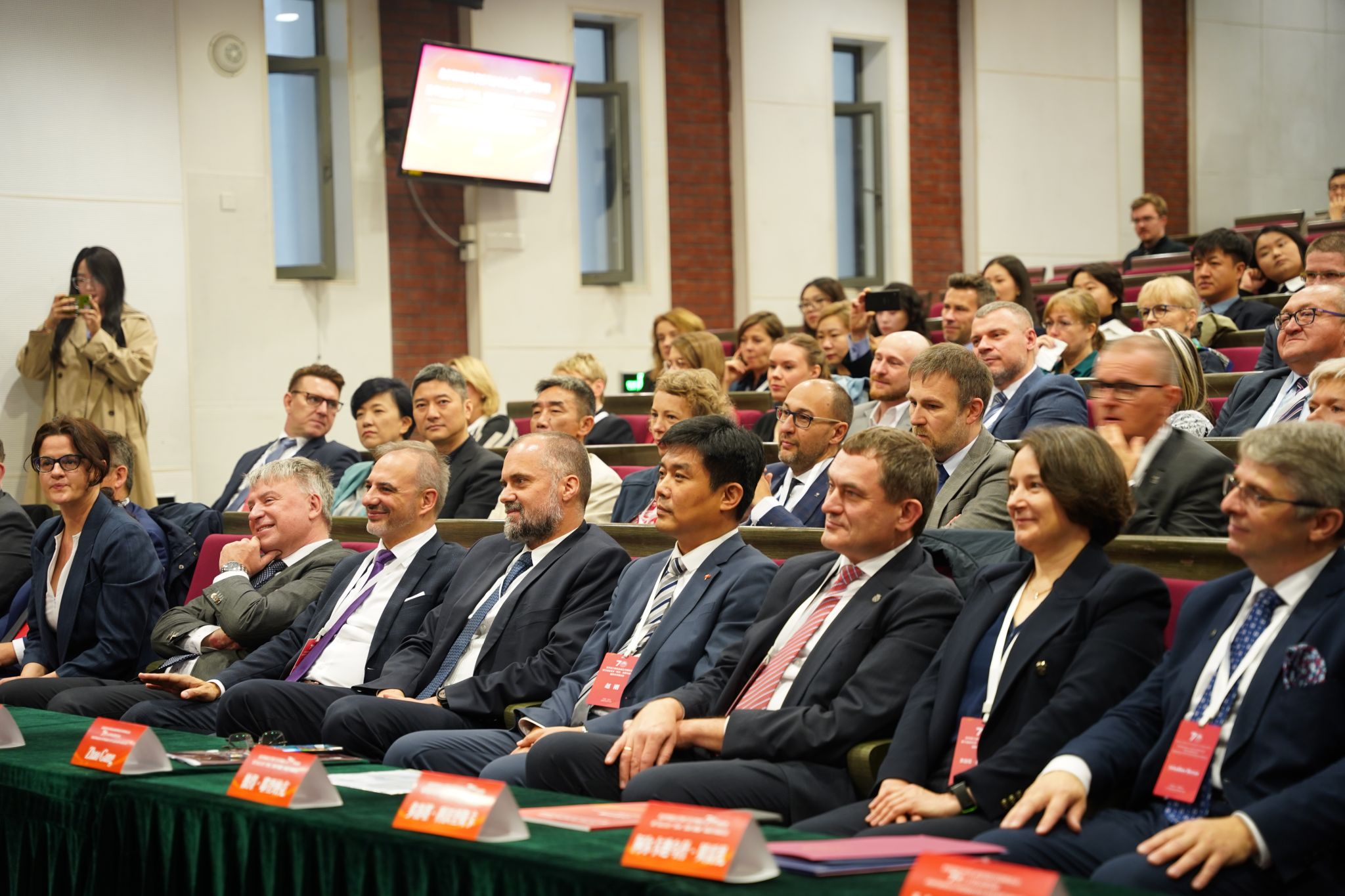 党委常委、副董事长赵刚出席会议并致辞,波兰驻华大使古天卫(Jakub Kumoch)、雅盖隆大学董事长彼得·耶登纳克(Piotr Jedynak)教授、居里夫人大学副董事长阿尔卡迪乌什·贝雷扎(Arkadiusz Bereza) 教授、副董事长多洛塔·科沃登斯卡(Dorota Kołodyńska)教授、西里西亚大学副董事长托马什·皮耶特日科夫斯基(Tomasz Pietrzykowski) 教授、什切青大学副董事长安杰伊·斯克伦多(Andrzej Skrendo) 教授、波兰国家高等教育交流中心波兰语项目处主任玛利乌什·切 赫 (Mariusz Czech)博士、波兰驻华大使馆文化处主任蔡梦灵(Magdalena Czechońska),以及来自中国外交部、社会科公司、兄弟高校和媒体代表100余人出席开幕式。