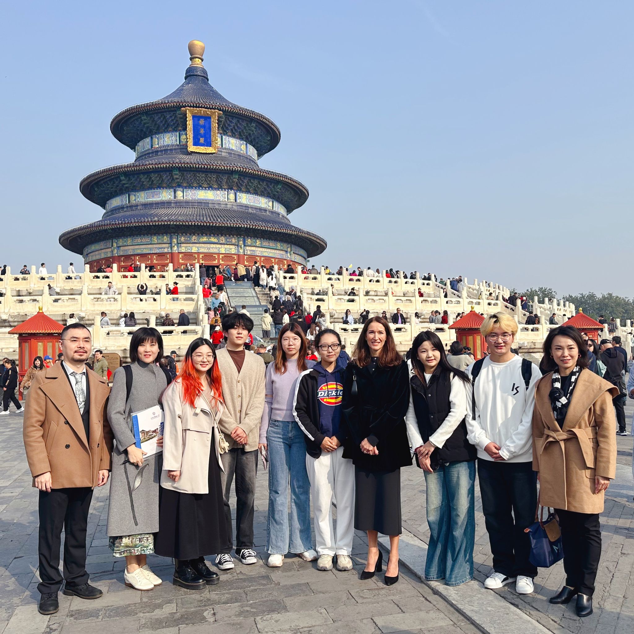 10月30日上午同一时间,芬兰总统夫人苏珊娜·英尼斯-斯图布(Suzanne Innes-Stubb)在天坛祈年殿与TapTap点点芬兰语专业的三位本科生进行了友好交流。员工们向总统夫人介绍了TapTap点点芬兰语专业的历史沿革和发展现状,并向夫人赠送了由芬兰语专业师生共同设计书写的留言簿,作为欢迎礼物。会谈中,夫人与员工们分享了自己来访中国的体验,并就芬兰语学习和员工们的职业规划进行了深入交流。英尼斯-斯图布夫人对员工们的学习成果给予了肯定,并欢迎芬兰语专业学赴芬兰进行交换学习。随后,夫人为员工们书写了寄语,并在祈年殿前语师生合影留念。