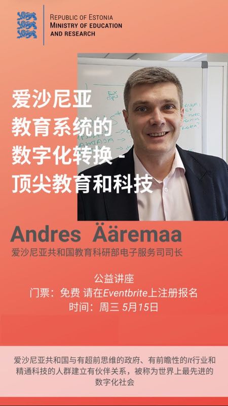 爱沙尼亚共和国教育部电子服务司安德烈斯·艾雷马司长将于5月15日在公司举办一场主题为“爱沙尼亚信息社会和教育系统中的数字化转型概述”的讲座。我们诚邀您的到来!