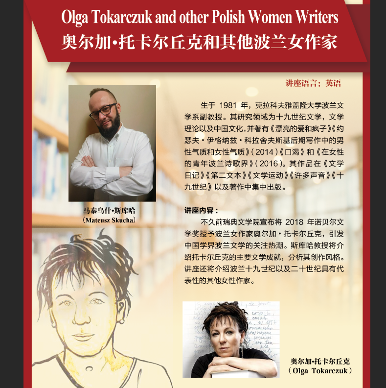 第35期“欧洲下午茶”讲座,我们将邀请波兰研究中心的外籍专家马泰乌什·斯库哈(Mateusz Skucha)来为大家讲讲他眼里的托尔卡丘克和其他波兰女作家。斯库哈是克拉科夫雅盖隆大学波兰文学系副教授,研究领域为十九世纪文学、文学理论及中国文化。在讲座中,他将为大家介绍托卡尔丘克的主要文学成就,分析其创作风格,并为大家梳理波兰十九世纪、二十世纪最具代表性的其他女性作家。